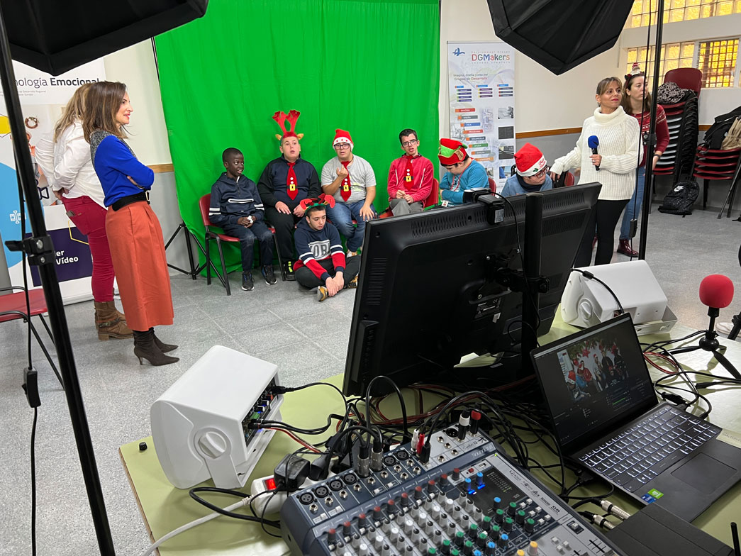 Esta iniciativa educativa ha arrancado con tres talleres de Tecnología Emocional. El primero de ellos es un estudio de televisión para digitalizar testimonios de personas mayores y acercarles la tecnología digital desde una perspectiva activa y motivadora. Durante la actividad de ayer, los alumnos participantes grabaron vídeos musicales navideños y testimonios del alumnado y profesorado del CEE Eusebio Martínez.