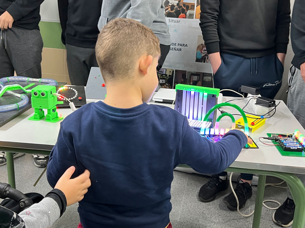 El último taller está dedicado a la ideación, diseño, programación y fabricación de soluciones digitales que ayuden a mejorar la calidad de vida de las personas mayores, especialmente en sus hogares, aplicando un modelo colaborativo intergeneracional basado en abuelos/as y nietos/as, durante todo el proceso, desde la identificación de la necesidad y la ideación de la solución, hasta las pruebas finales, aplicando para ello metodologías y herramientas propias del diseño centrado en las personas. Durante la actividad celebrada ayer, este taller mostró al alumnado de educación especial diversos desarrollos robóticos realizados por DGMakers.