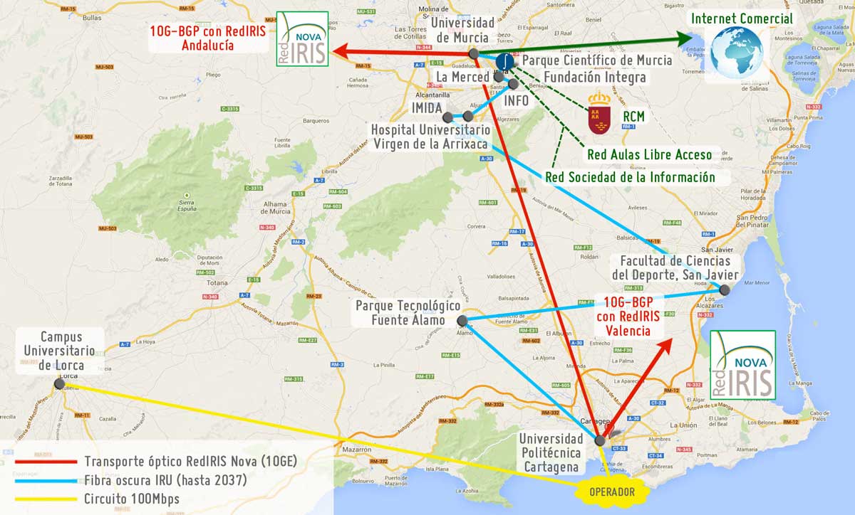 También está interconectada mediante una conexión a 10Gbps con la Red Corporativa Multiservicio, que da servicio a los centros sanitarios y Consejerías y resto de dependencias de la Administración Regional.